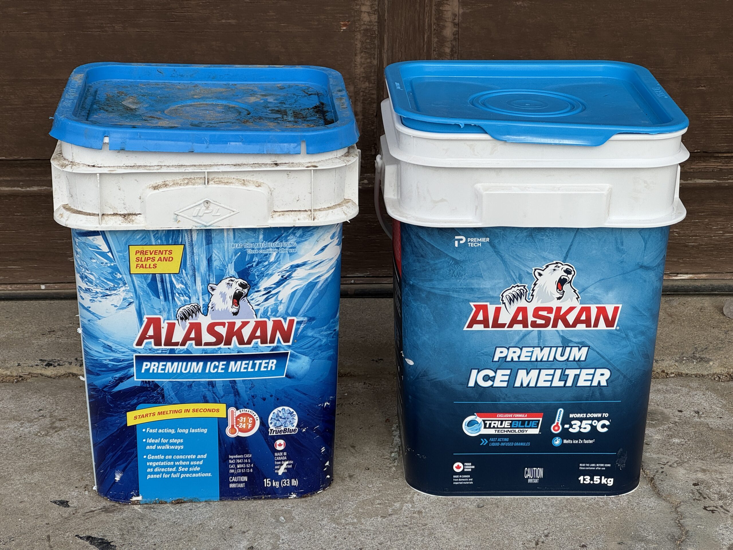 One of these jugs is not like the other. On the left – last year’s ice melter, with 15 kg of salt. On the right – this year’s, with 13.5 kg – a 10 per cent reduction. Photo by Brian Zinchuk