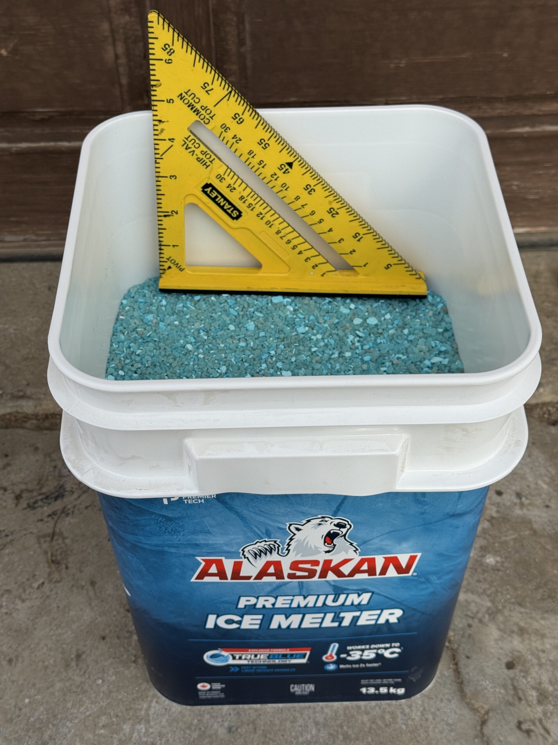 A few days ago I opened a new bucket of Alaskan ice melter salt and wondered why it was four or five inches from the top. (I measured – it was 4.5 inches)