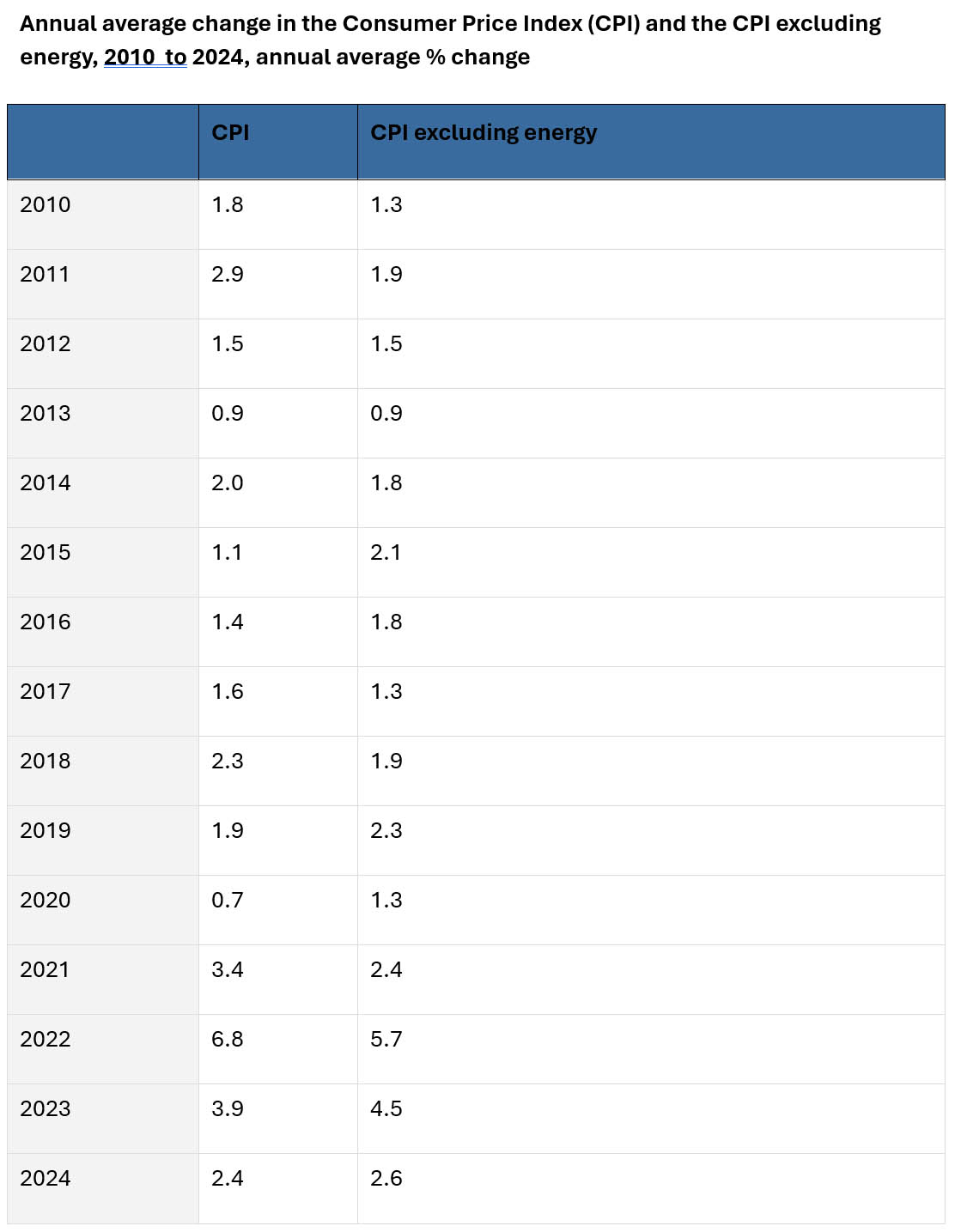 I absolutely do not agree with government published inflation rates. According to Statistics Canada, the November annual inflation rate was 2.2 per cent. And for 2024, it was 2.4 per cent. Indeed, here’s their chart, found here: