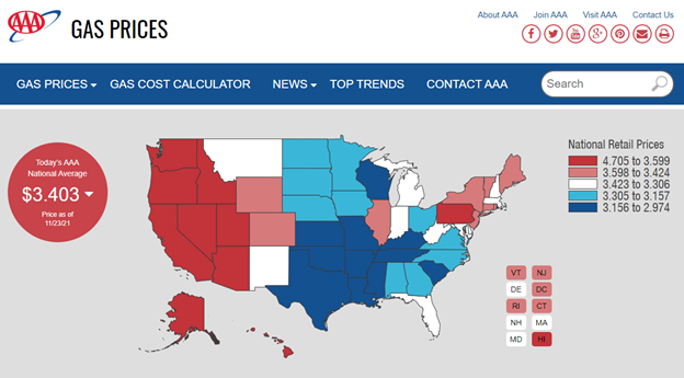 According to AAA, on Nov. 23, the state average for California was US$4.705 per US gallon. (Note, a U.S. gallon is 3.785 litres, where as an Imperial gallon is 4.54 litres. I’m going to use US gallons here.) It’s $4.352 in Hawaii, $3.974 in Nevada, and $3.877 in Washington. You can see them all in this pdf. AAA Gas Prices Nov 23 2021.