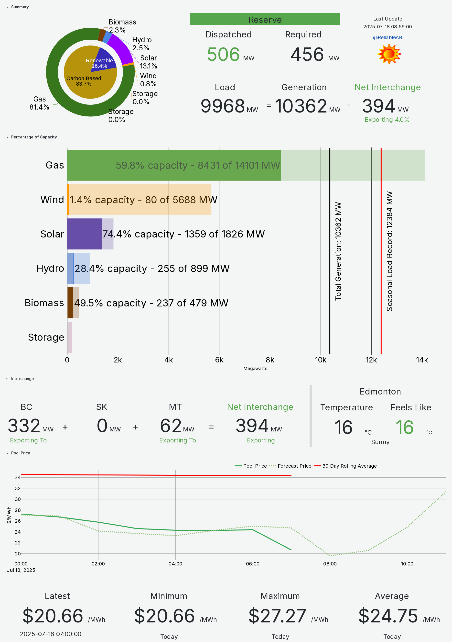 “At this moment, 18-Jul-2025 @ 08:59, 81.4% of Alberta’s electricity is being produced by fossil fuels. Wind is at 1.4% of capacity and producing 0.8% of total generation, while solar is at 74.4% of capacity and producing 13.1% of total generation. At the same time, we are exporting 394 MW, which is 3.8% of the total generation of 10362 MW,” @ReliableAB said.
