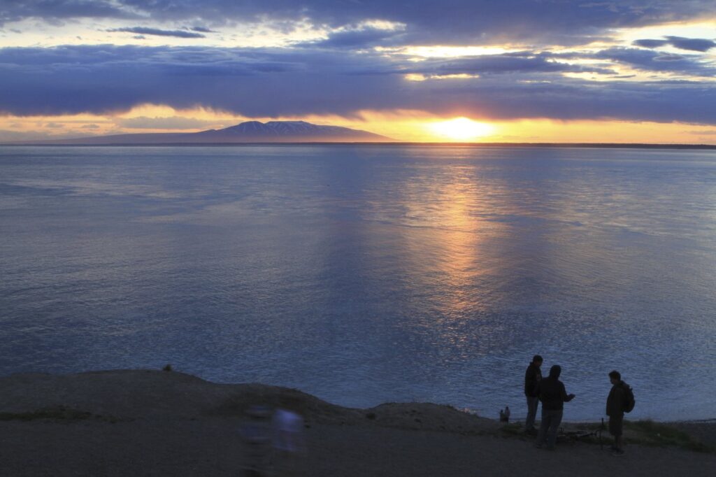 FILE – Visitors to Point Woronzof Park watch the sun set over Cook Inlet and Mount Susitna, also known as Sleeping Lady, on June 7, 2013, in Anchorage, Alaska. Alaska Gov. Mike Dunleavy has proposed a plan that could use the Cook Inlet basin for carbon sequestration. (AP Photo/Dan Joling, File)