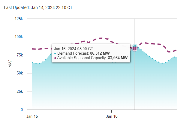 At 11:50 a.m. central time, the SPP said, “SPP is issuing a Conservative Operations Advisory for its entire Balancing Authority effective 4 a.m. CT Sunday, Jan. 14 with an anticipated end of 9 p.m. CT Tuesday, Jan. 16.