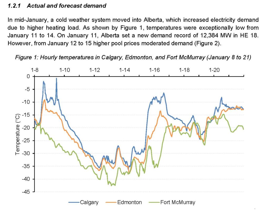 It goes into detail on why each of those thermal units were down, several of which were scheduled to be down for maintenance well in advance. It also points out that some thermal units oversold their generating capacity, saying, “As of January 6, some assets declared their default availability for January 13, i.e., the declared availability was set equal to, or close to, the asset’s maximum capability. The actual availabilities for the Fort Hills (FH1) and Nexen Inc #2 (NX02) assets were later lowered to reflect ambient temperatures. The availability of Christina Lake (MEG1) was later lowered to reflect site conditions, and the availability of Syncrude #1 (SCL1) was later lowered to reflect ambient temperatures, site conditions, and some generator outages at the site.”