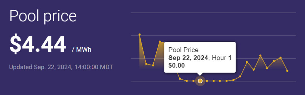 EDMONTON – For seven hours on Sept. 21-22, the Alberta Electric System Operator (AESO) reported a pool price of zero dollars per megawatt. This odd behaviour of the market is not a new thing, however. It also happened in August, and happens from time to time.