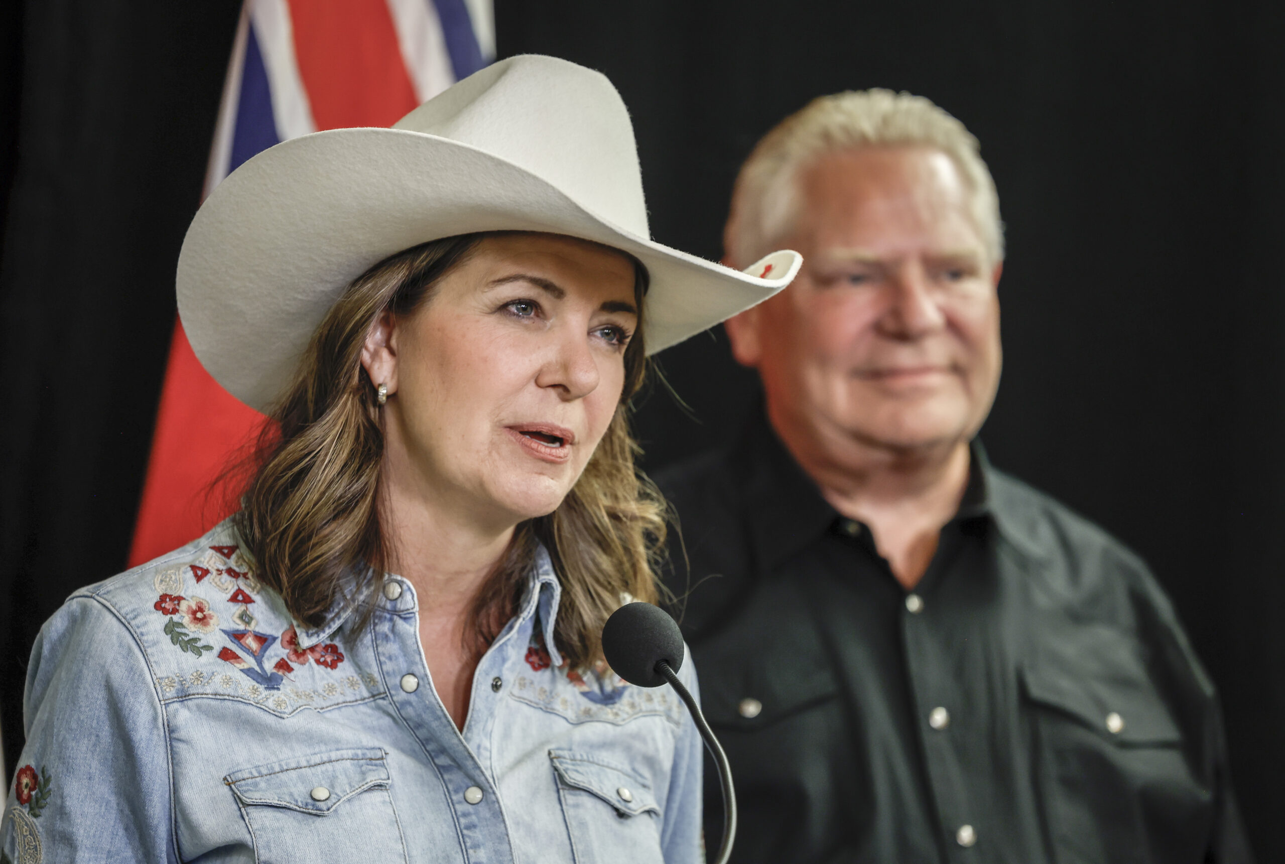 Ontario Premier Doug Ford, right, and Danielle Smith, Premier of Alberta, speak before signing agreements to build new energy and trade infrastructure in Calgary, Alta., Monday, July 7, 2025. THE CANADIAN PRESS/Jeff McIntosh