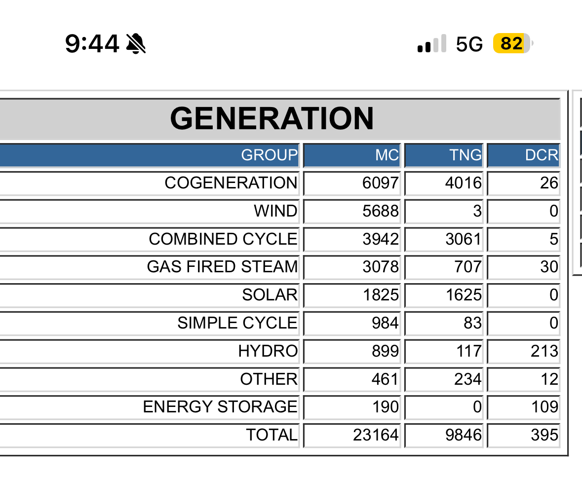 This was Alberta’s grid at 9:44 a.m. on Thursday, April 24. MC is Maximum Capacity, in megawatts. TNG is Total Net to Grid, and DCR is Dispatched (and accepted) Contingency Reserve. Alberta Electric System Operator