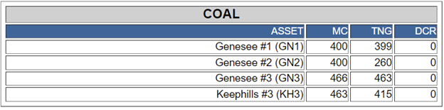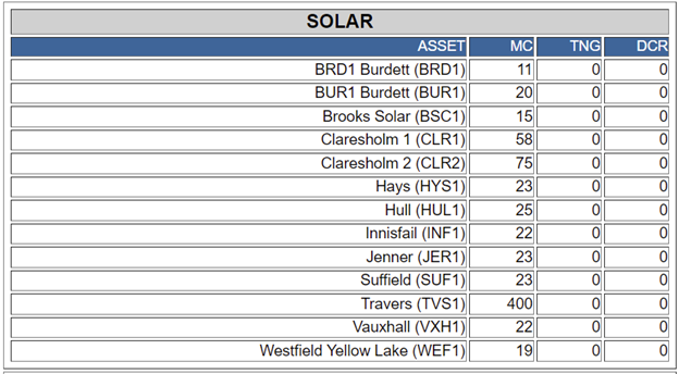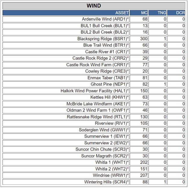 For all these graphics, MC means maximum capacity (in megawatts), TNG is total total net generation and DCR is dispatched (and accepted) contingency reserve. Source: Alberta Electric System Operator