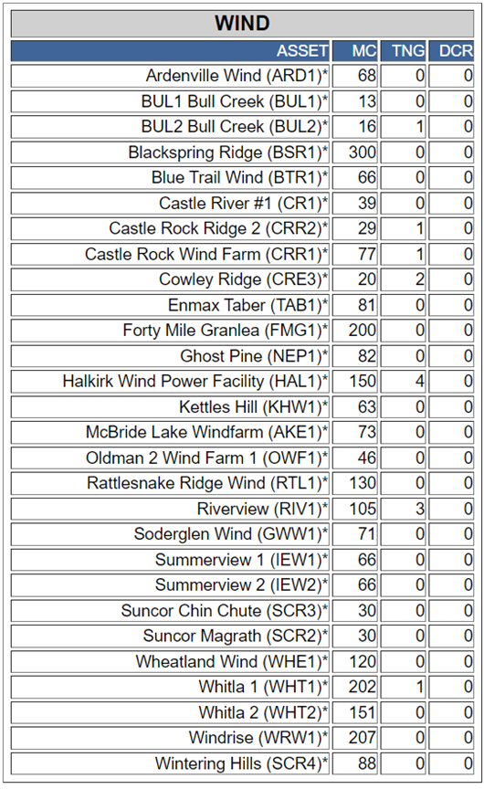 Two of them, Wheatland Wind’s 120 megawatt facility, and Suncor’s 200 megawatt Forty Mile Granlea, are recent additions to the list and do not appear to be producing power yet. But the other 19 typically do.