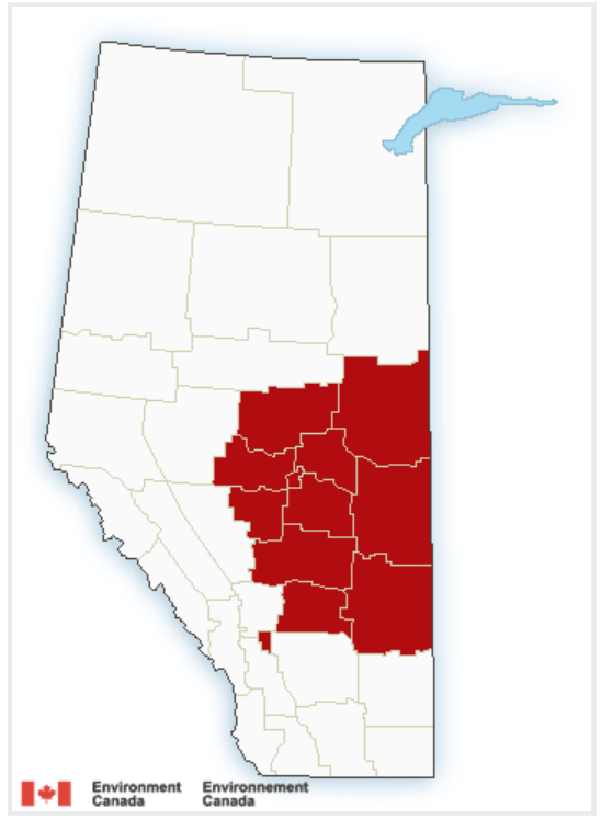 Heat warnings blanketed much of central Alberta, as seen from Environment Canada.