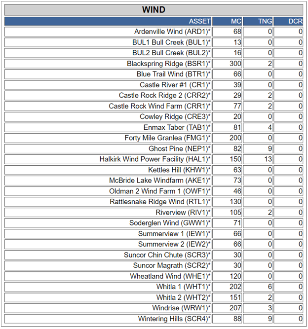 Of those 28 wind farms, 17 were generating precisely zero megawatts for grid consumption. Two of those are recent additions, Suncor’s Forty Mile Granlea (200 megawatts) and Wheatland Wind (120 megawatts), and may not be fully operational, but they are listed.