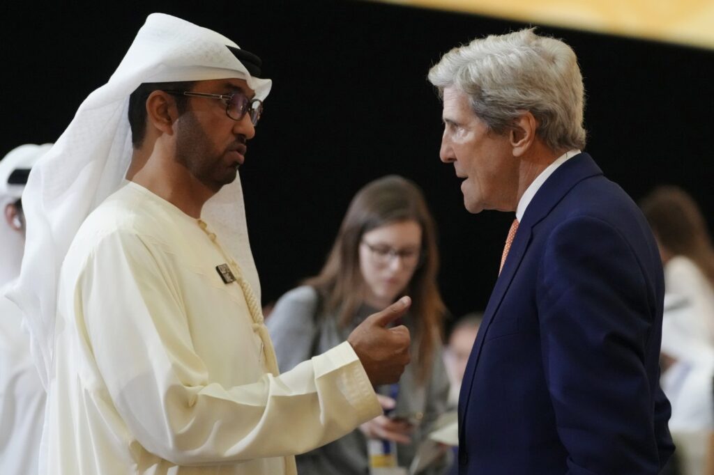 COP28 President Sultan al-Jaber, left, and John Kerry, U.S. Special Presidential Envoy for Climate, speak as they attend a meeting at the COP28 U.N. Climate Summit, Sunday, Dec. 10, 2023, in Dubai, United Arab Emirates. (AP Photo/Peter Dejong)