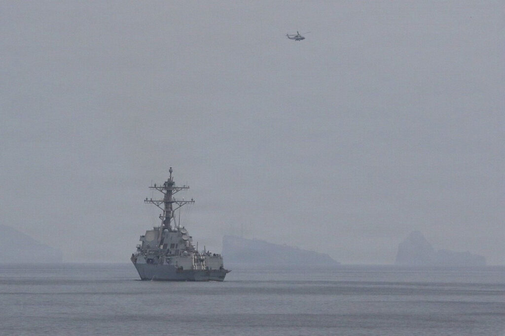 A Navy destroyer in the U.S. Central Command area of operations transits the Strait of Hormuz, April 11, 2026. The destroyers USS Frank E. Peterson and USS Michael Murphy transited the strait and operated in the Persian Gulf as part of a broader mission to ensure the strait is fully clear of sea mines previously laid by Iran’s Islamic Revolutionary Guards Corps.