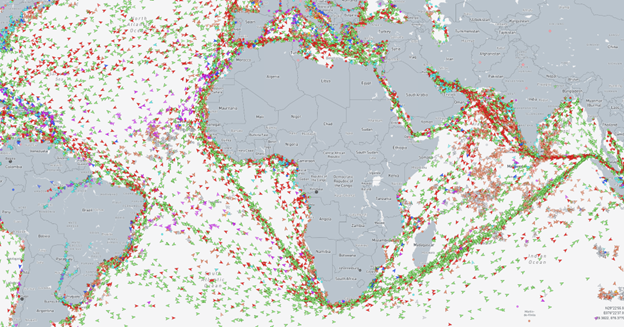 World shipping on Feb. 5, according to MarineTraffic.com. The amount of shipping running through the Indian Ocean around the South Africa is nowhere close to normal. Usually there’s a thick line of vessels from Sri Lanka to the entrance of the Gulf of Aden. That line hardly exists now, but the line running to South Africa is noticeably denser. MarineTraffic.com