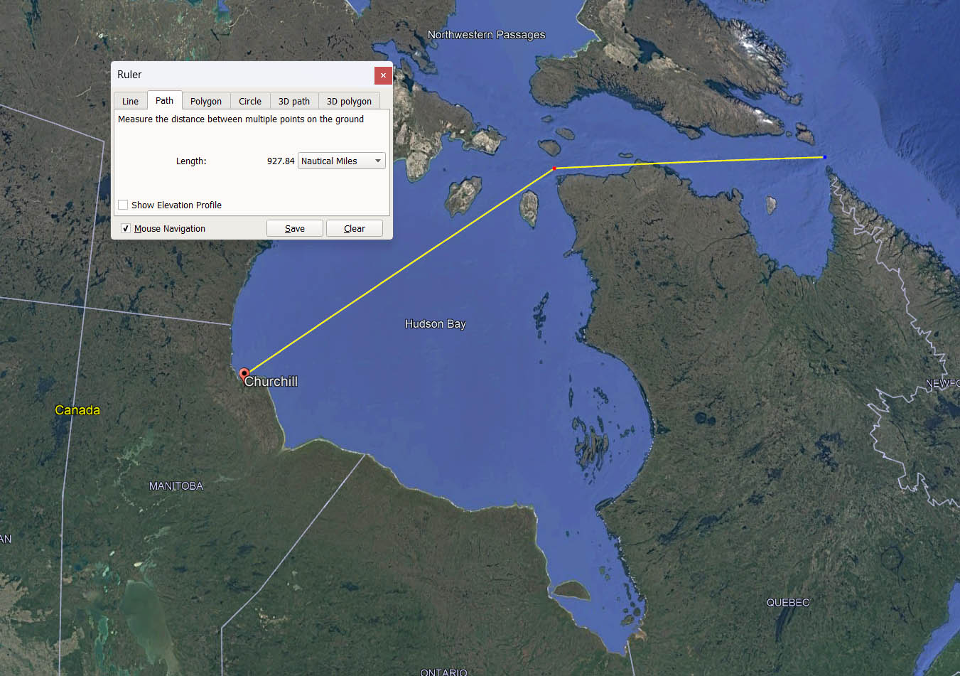 Here’s a straigh-line path from Churchill to open, ice-free water at the northern tip of Labrador. Google Earth.