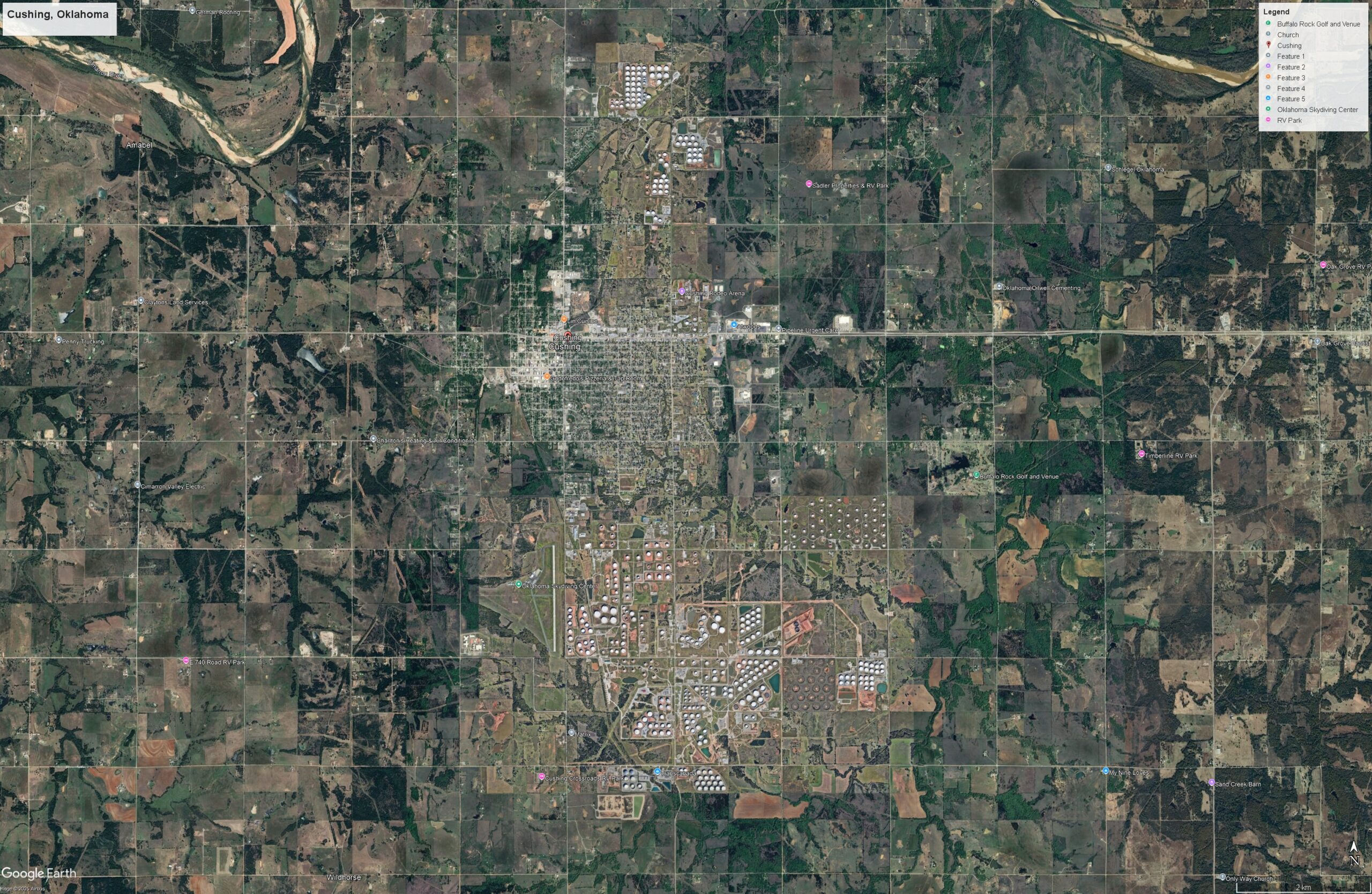 See every white dot on this Google Earth image of Cushing, Oklahoma? That’s an oil storage tank the likes of which you would find on Edmonton’s Refinery Row or near the Regina Refinery. You would need to build double that amount at Churchill or Port Nelson to handle storing six months of oil at one million barrels per day. Google Earth
