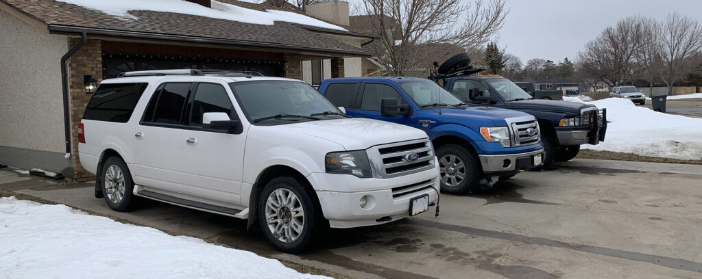 From left: my Expedition, my wife’s F-150, and my daughter’s Dodge 3500 one ton. If these were EVs, how much power would my house need to charge them? Photo by Brian Zinchuk