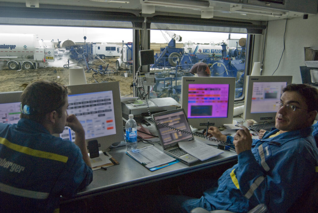 Schlumberger frac crew in 2008. The screens have been blurred to protect proprietary data. Photo by Brian Zinchuk