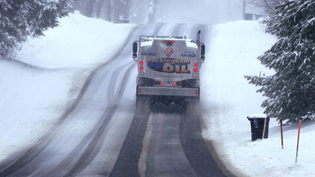 FILE – A home heating oil delivery truck climbs a snow covered road, Feb. 28, 2023, in Derry, N.H. Americans who struggled because of inflation may get a break on heating costs this winter. The US federal government says nearly half the nation that uses natural gas for heat is projected to see lower costs while electricity remains relatively stable, but there’s angst in the nation’s northeast corner with projections for higher heating oil costs. The Biden administration released most of the current $4 billion in home energy assistance to states on Tuesday, Oct. 24. (AP Photo/Charles Krupa, File)
