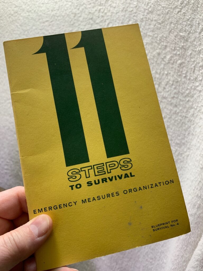 In cleaning it, I came across a yellow booklet called 11 Steps to Survival. It was printed in 1961, and the foreword was signed by Prime Minister John G. Diefenbaker.