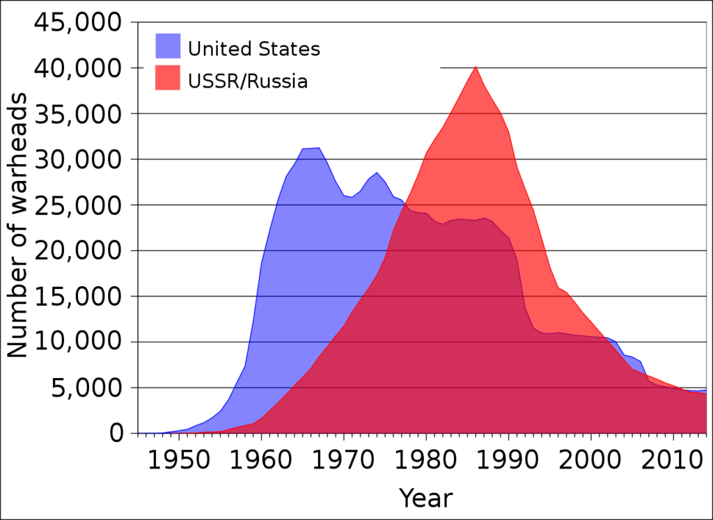 This graph doesn’t show recent years, where nuclear stockpiles on both sides have fallen to under 2,000 warheads each. Created by User:Fastfission first by mapping the lines using OpenOffice.org’s Calc program, then exporting a graph to SVG, and the performing substantial aesthetic modifications in Inkscape. – Own workSource data from: Robert S. Norris and Hans M. Kristensen, “Global nuclear stockpiles, 1945-2006,” Bulletin of the Atomic Scientists 62, no. 4 (July/August 2006), 64-66. Online at http://thebulletin.metapress.com/content/c4120650912x74k7/fulltext.pdf, Public Domain, https://commons.wikimedia.org/w/index.php?curid=1514245