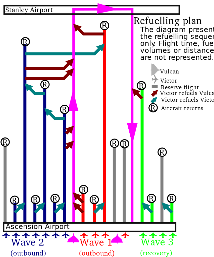 There’s an example of this in military air-to-air refuelling, 40 years ago this month, during the Falkland Islands War. Britain was desperate to take out the main runway at Port Stanley with a bombing raid. The closest airfield they had was on Ascension Island, in the very middle of the South Atlantic. The target was 12,600 kilometres away, round trip. They could do using a series of air-to-air refueling tankers, each passing along some of its fuel to the next in the chain. But to get just one, singular Vulcan bomber over the target, it took 17 planes – yes, you read that right – 2 bombers and 15 tankers, to get just one bomb on that runway.