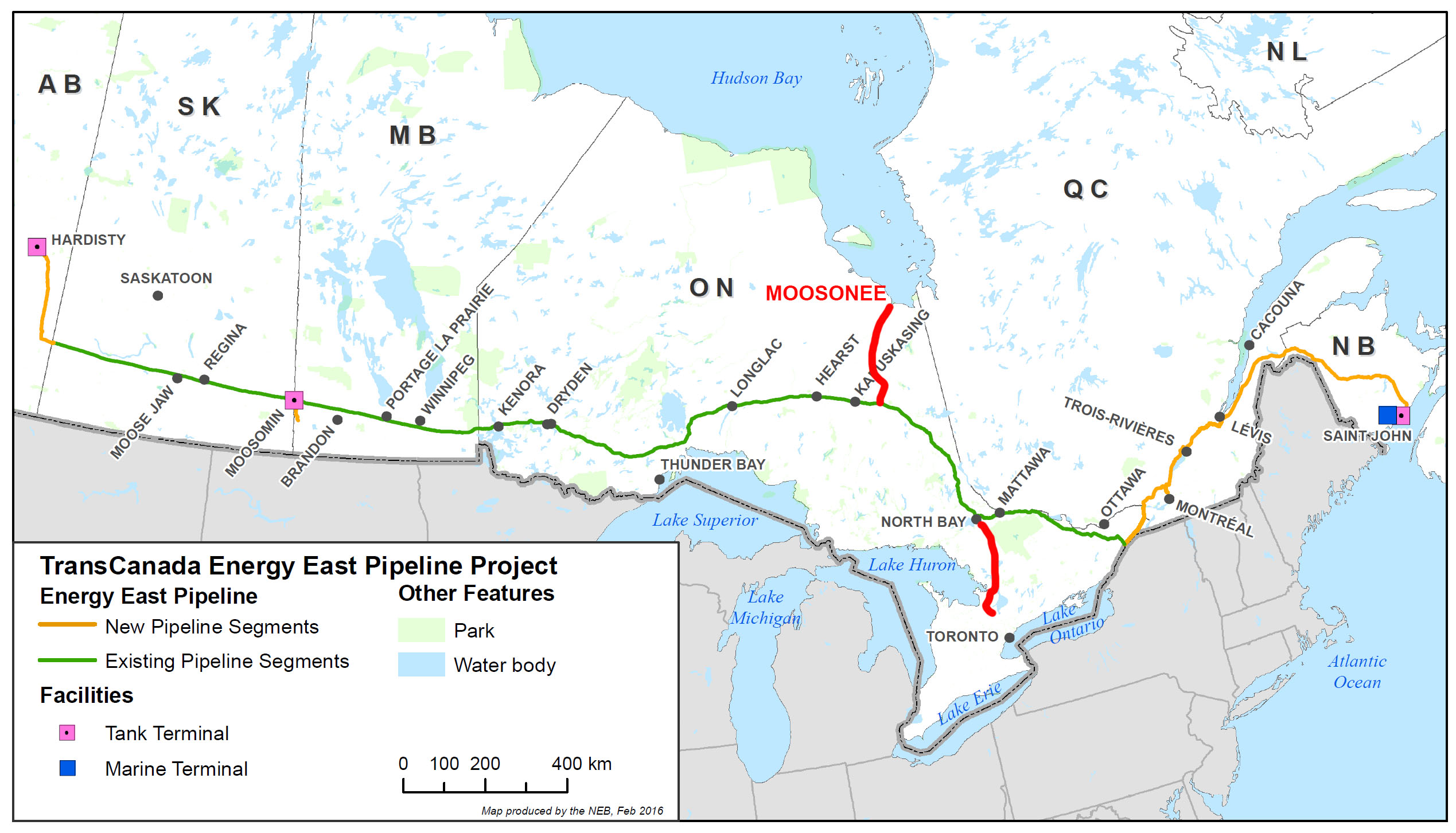 In this idea of reviving Energy East, the red line going to Moosonee would be about 275 kilometres of new right-of-way and pipeline. That gets you to tidewater. The second red line to the south gets you to southern Ontario along an existing TC Energy right-of-way, but would likely need to go further than that. Everything east of Mattawa could be ignored. CER original map