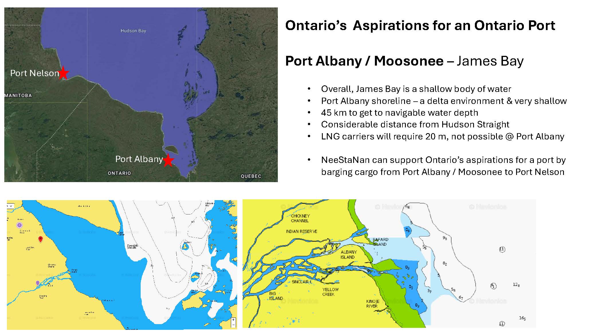 This slide from NeeStaNan’s presentation shows the locations of Port Albany, northwest of Moosonee, and the shallow waters. NeeStaNan