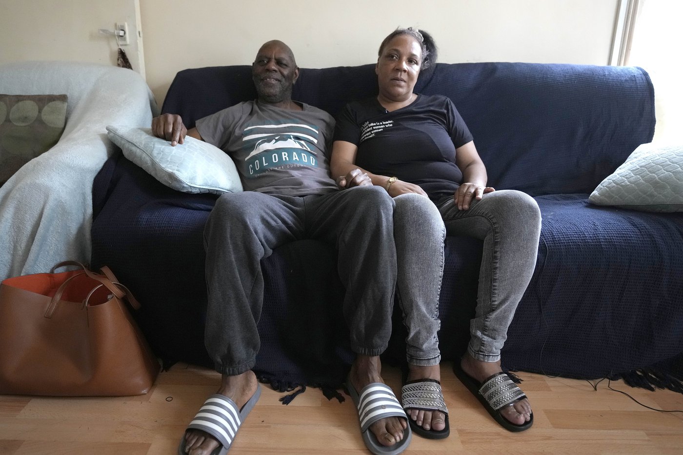 Jennifer Jones and Stan Bailey sit in their small flat in London, Thursday, Aug. 25, 2022. Like millions of people, Jones, 54, is struggling to cope as energy and food prices skyrocket during Britain’s worst cost-of-living crisis in a generation. The former school supervisor has health problems and relies on government benefits to get by, but her welfare payments are nowhere near enough to cover her sharply rising bills. (AP Photo/Frank Augstein)