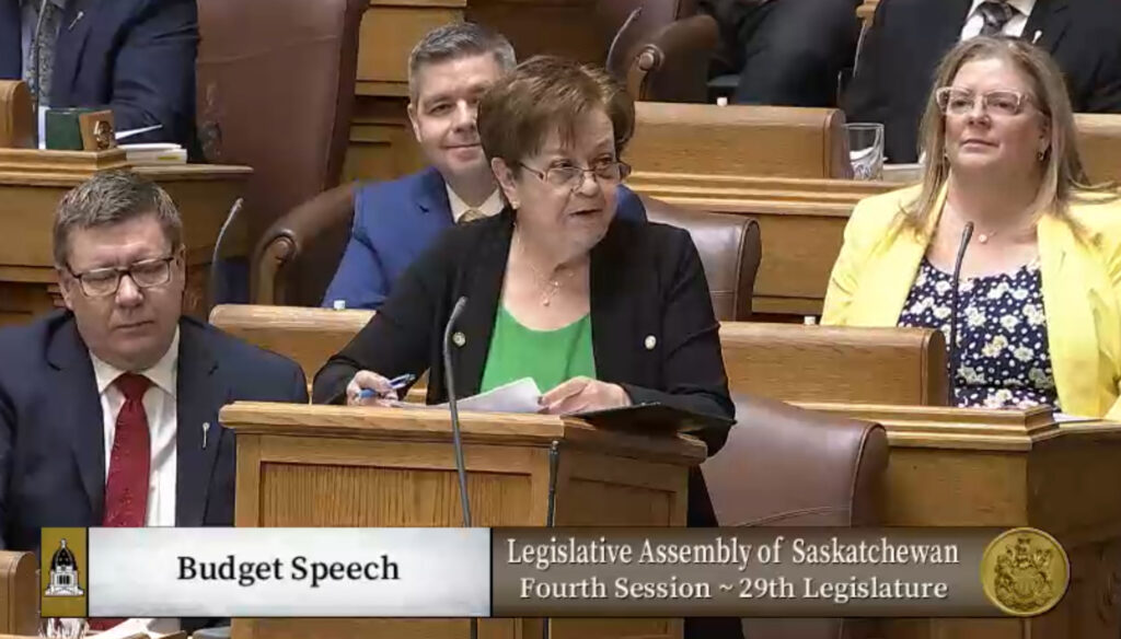 Finance Minister and Deputy Premier Donna Harpauer delivering her last budget speech. Legislative Assembly of Saskatchewan