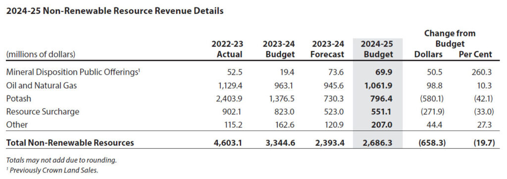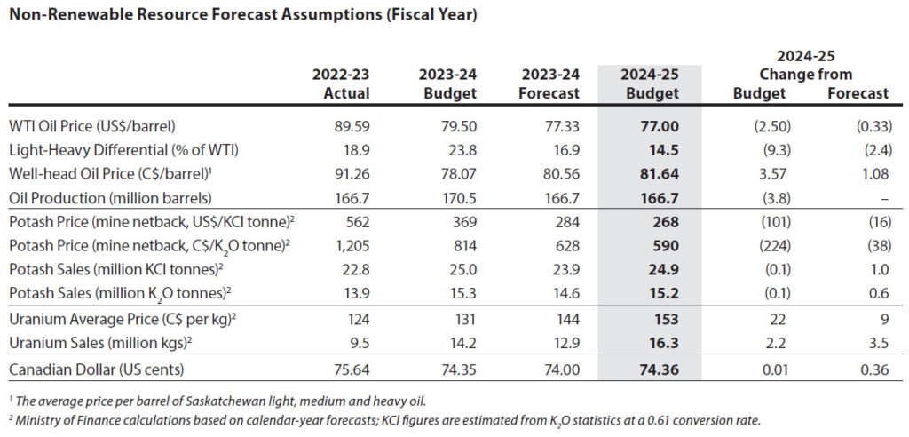 It also said, “Revenue from the Resource Surcharge is budgeted to decrease $271.9 million from the 2023-24 Budget, primarily reflecting decreased potash prices in 2024-25. However, revenue from Mineral Disposition Public Offerings and all Other non-renewable resources (including uranium) are forecast to increase by a combined $94.9 million from the 2023-24 Budget, mainly due to increased mineral rights activity tied to the drilling of multi-lateral oil wells and higher uranium pricing and sales volumes.”