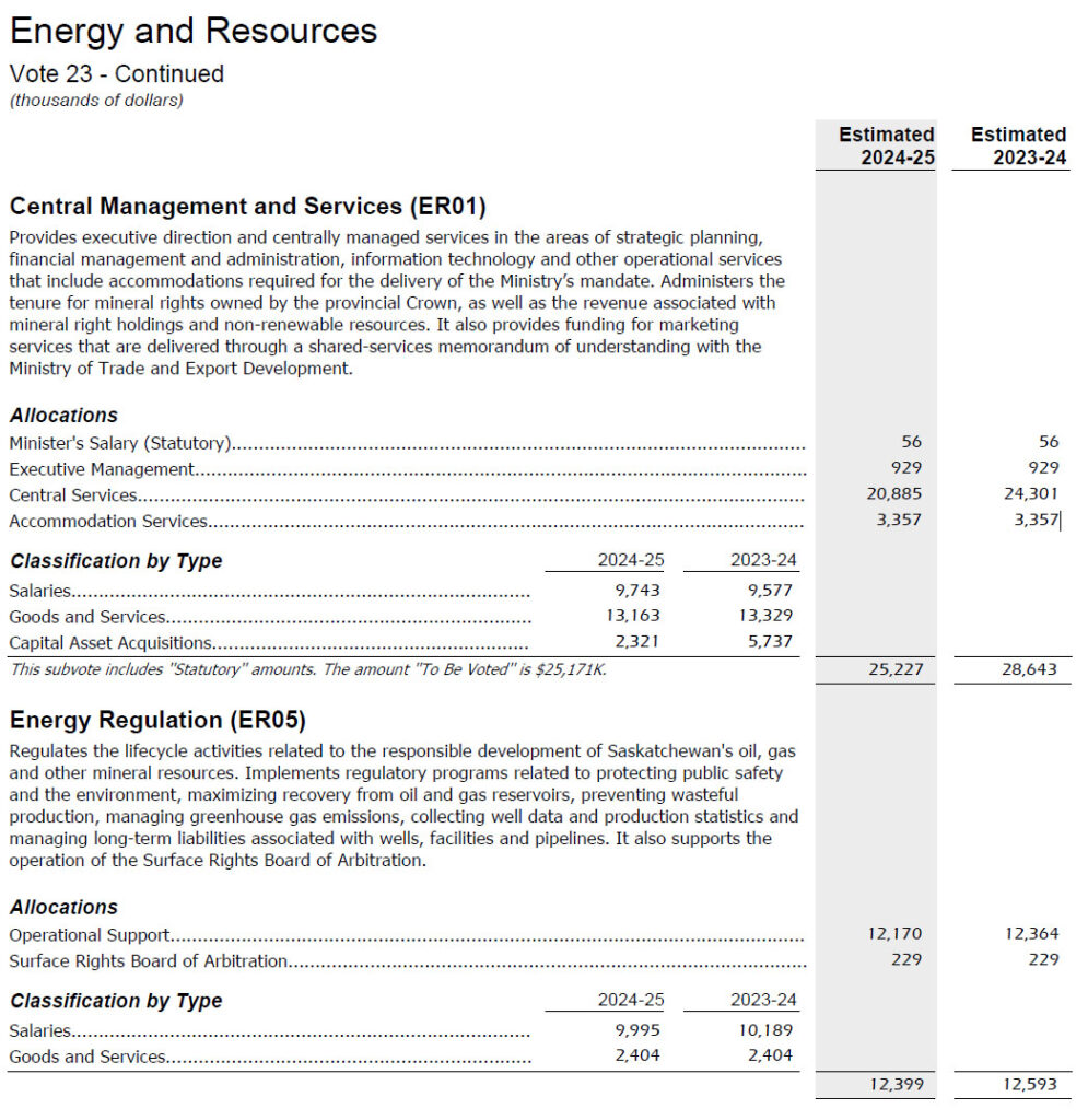 The Ministry of Energy and Resources, itself, is one of the smallest line-items among the various ministries. Its 2024-25 budget is $51.3 million, made of of $49 million in operating expenses and $2.3 million in capital expenses.