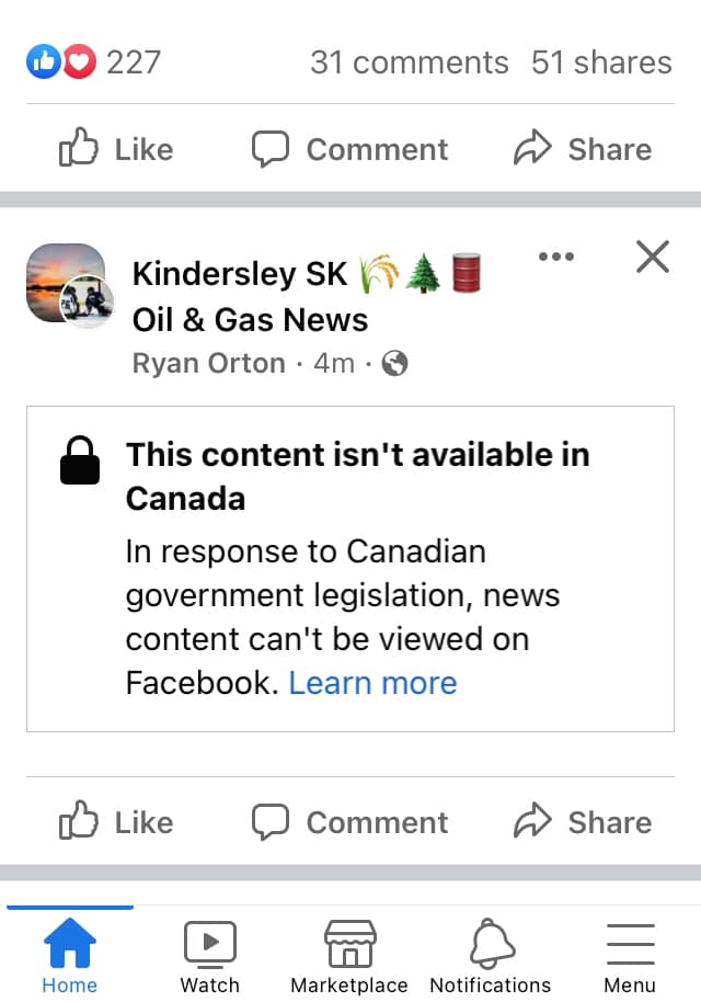 The morning of June 14, one person at Kindersley reported that Facebook is now cutting off posts from Pipeline Online. “In response to Canadian Government Legislation, news content can’t be viewed on Facebook,” said the screenshot. “You can no longer share or view news links or content on Facebook, including news articles and audio-visual content. posted by news outlets. You can no longer see links or content from any news page outlets, even if you search for them or previously followed them.”