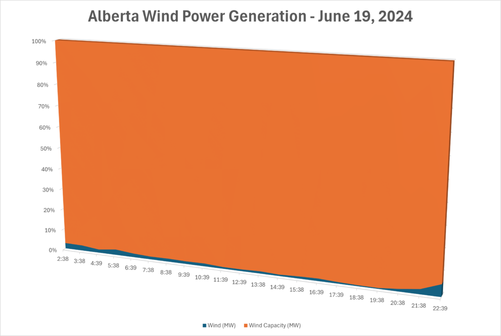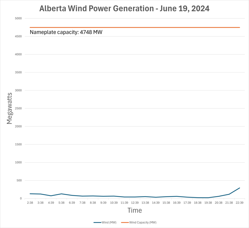 For nearly all of Wednesday, June 19, wind power generation in Alberta was abysmal. For 19 hours, Alberta’s wind power generation was next to nothing.