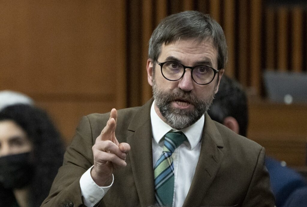 Minister of Environment and Climate Change Steven Guilbeault rises during Question Period, in Ottawa, Thursday, Feb. 17, 2022. Ottawa said in a press release that Guilbeault has been granted another 40 days to review the “extensive information” about whether the proposed Bay du Nord project will have significant environmental impacts. THE CANADIAN PRESS/Adrian Wyld