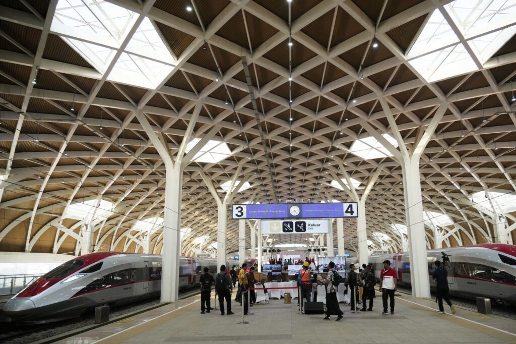 FILE – High-speed train is parked during the opening ceremony for launching Southeast Asia’s first high-speed railway, a key project under China’s Belt and Road infrastructure initiative, at Halim station in Jakarta, Indonesia on Oct. 2, 2023. China is touting its 10-year-old Belt and Road Initiative as an alternative model for economic development, releasing a government report that praises the program while glossing over criticism that it has saddled poor countries with too much debt. (AP Photo/Achmad Ibrahim, File)