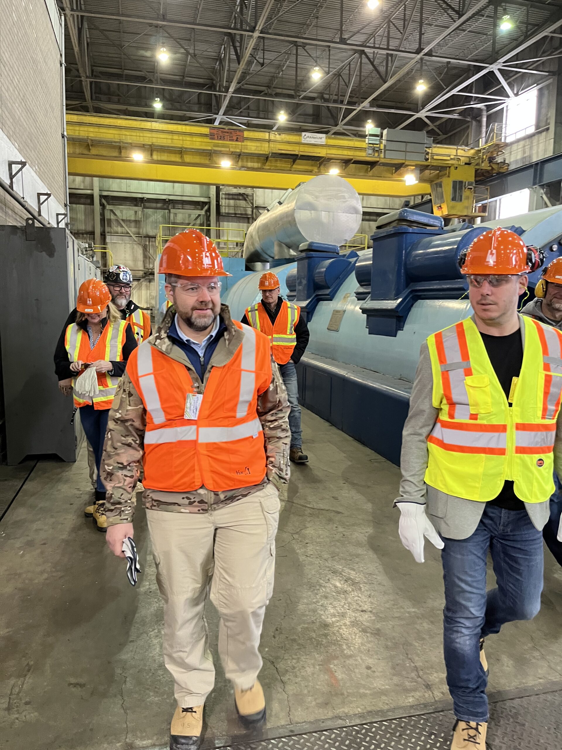 Crown Investments Corporation Minister Jeremy Harrison walking through Boundary Dam Power Station on Jan. 16, 2025, wearing camo instead of a suit. Photo submitted