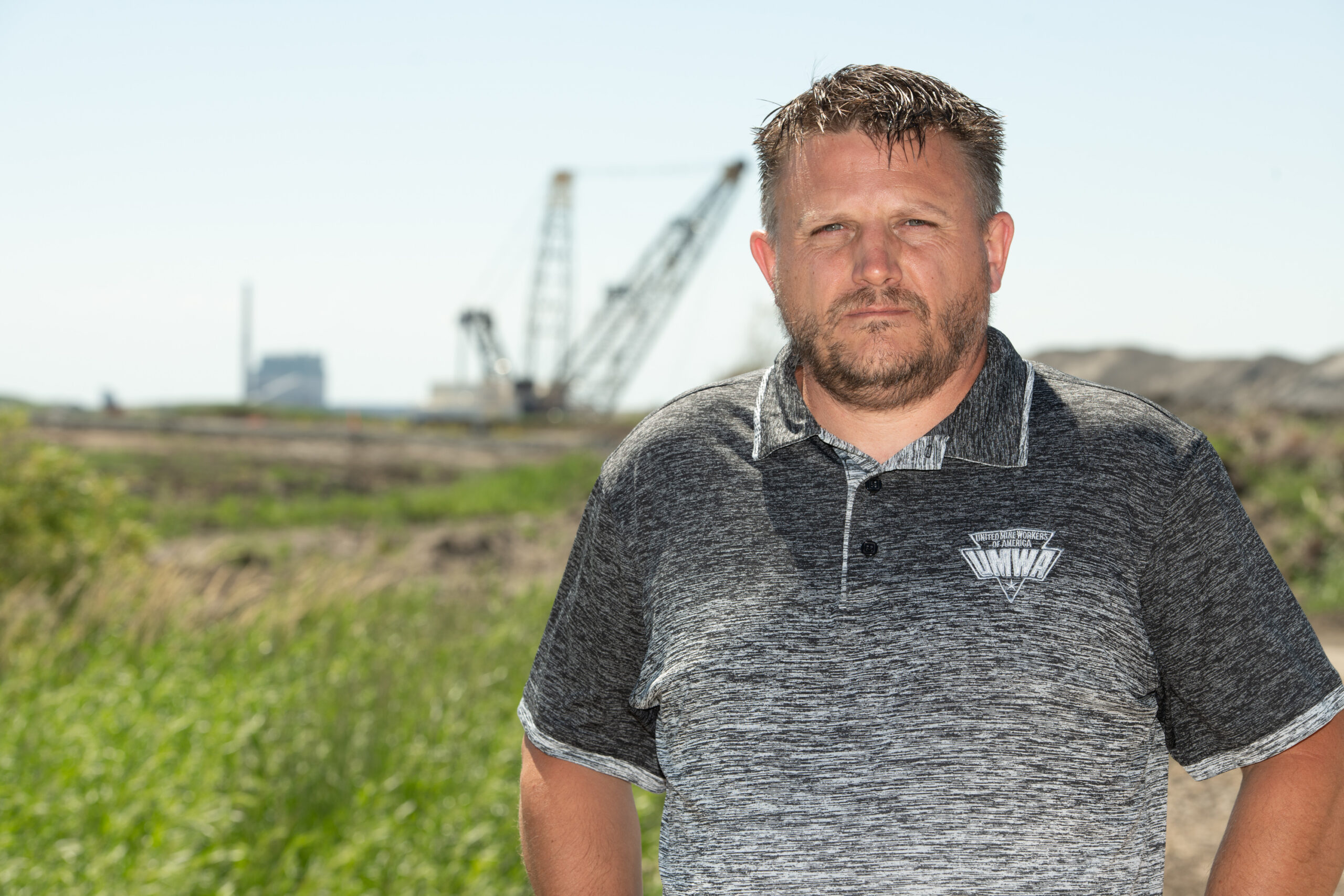 UMWA International Auditor/Teller Jody Dukart, with a dragline in front of Shand Power Station. Photo by Brian Zinchuk