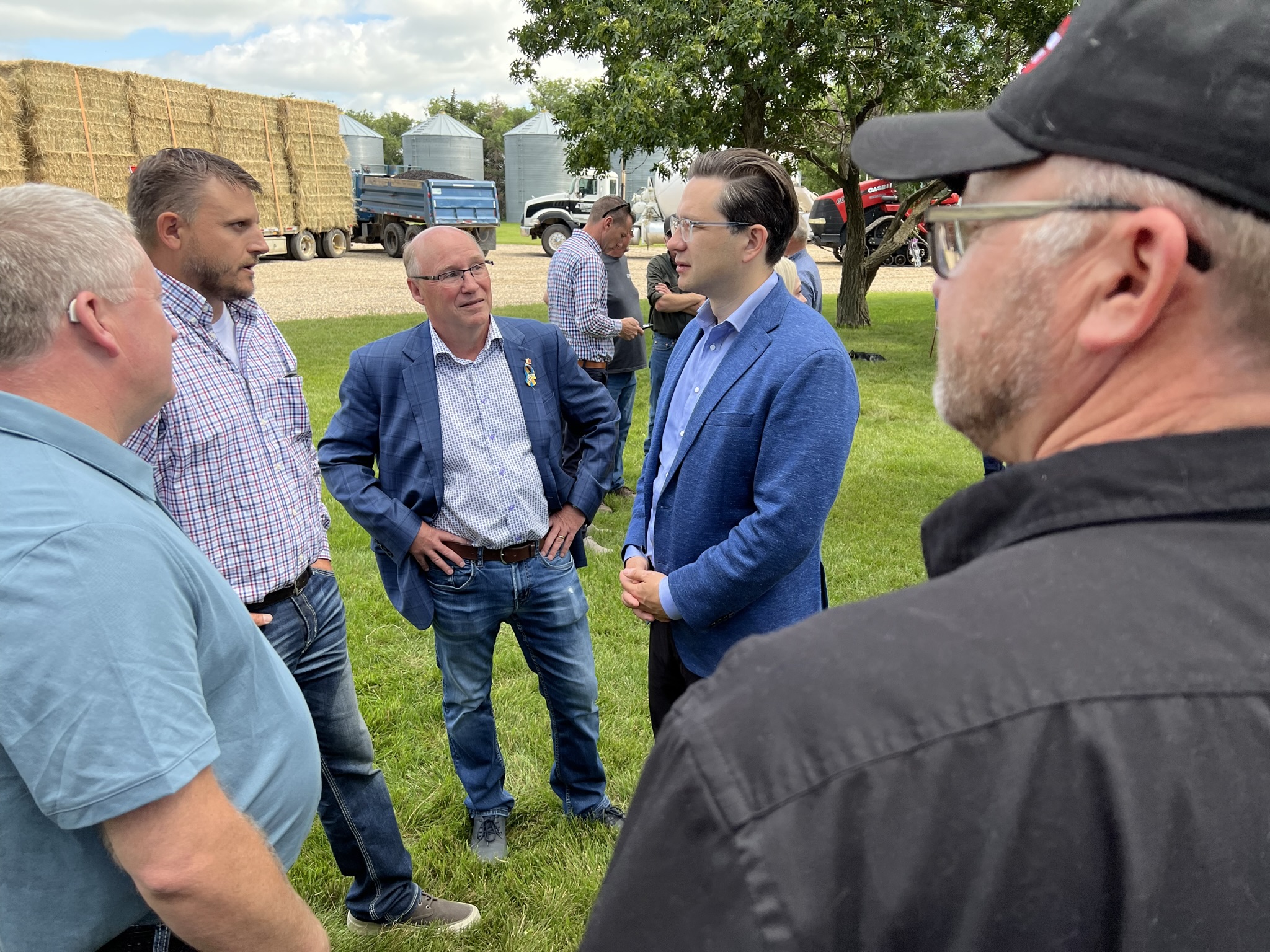 From left: Ashley Johnson, Jody Dukart, Robert Kitchen, Pierre Poilievre and Jason LeBlanc at LeBlanc’s farm in 2022. Photo by Brian Zinchuk
