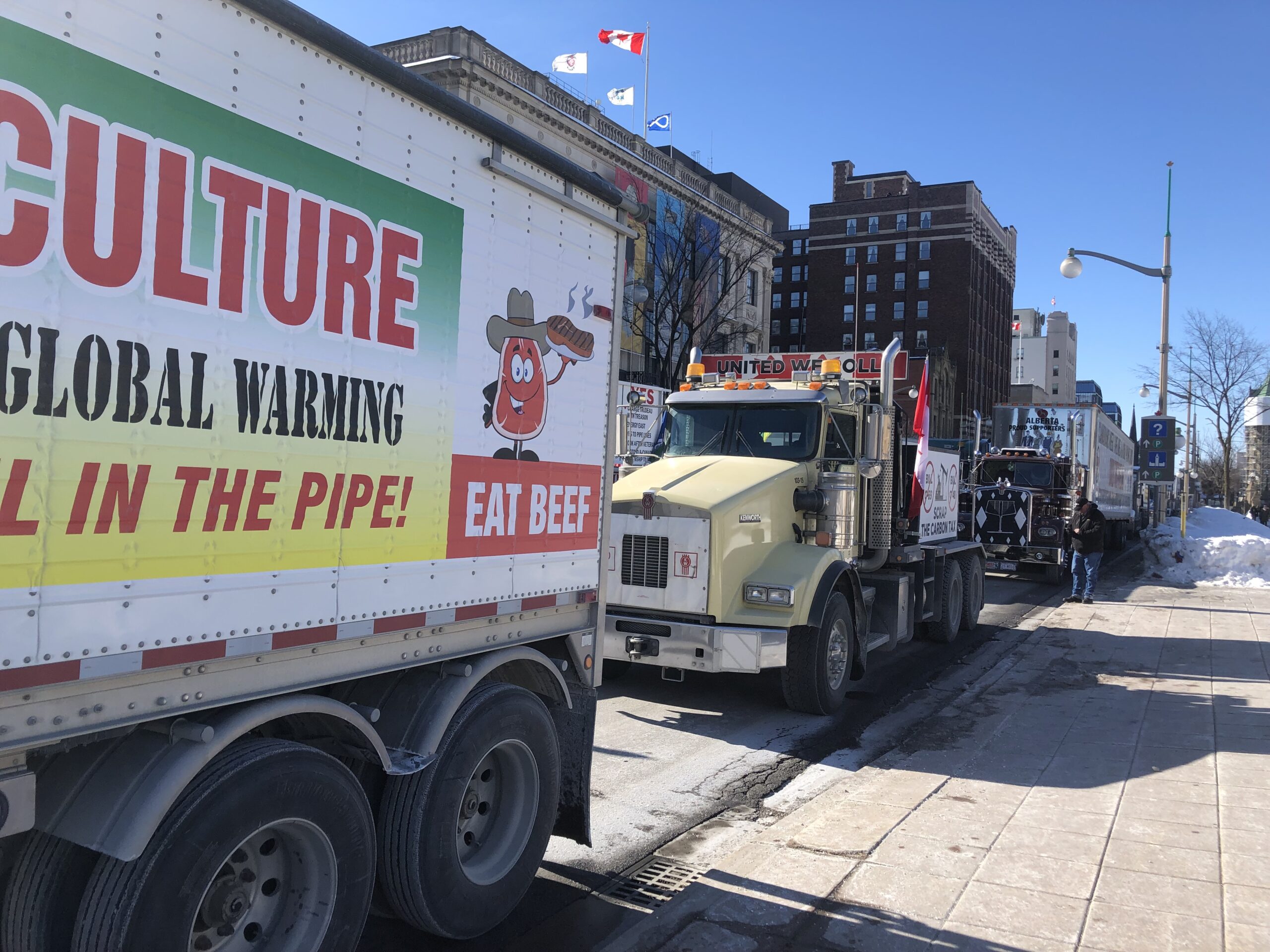 Left: Jason LeBlanc’s truck parked at the gates of Parliament, right, a truck belonging to Jerry Mainil Ltd.