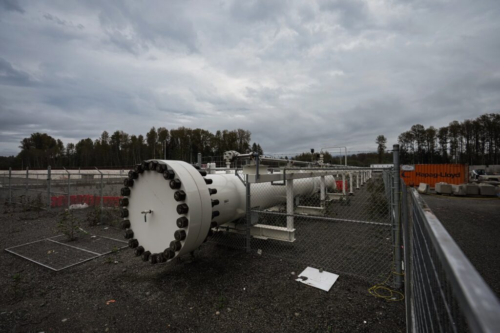 The terminus for the Coastal GasLink natural gas pipeline is seen at the LNG Canada export terminal under construction in Kitimat, B.C., on Wednesday, September 28, 2022. TC Energy Corp. says its Coastal GasLink pipeline project is 98 per cent complete. THE CANADIAN PRESS/Darryl Dyck