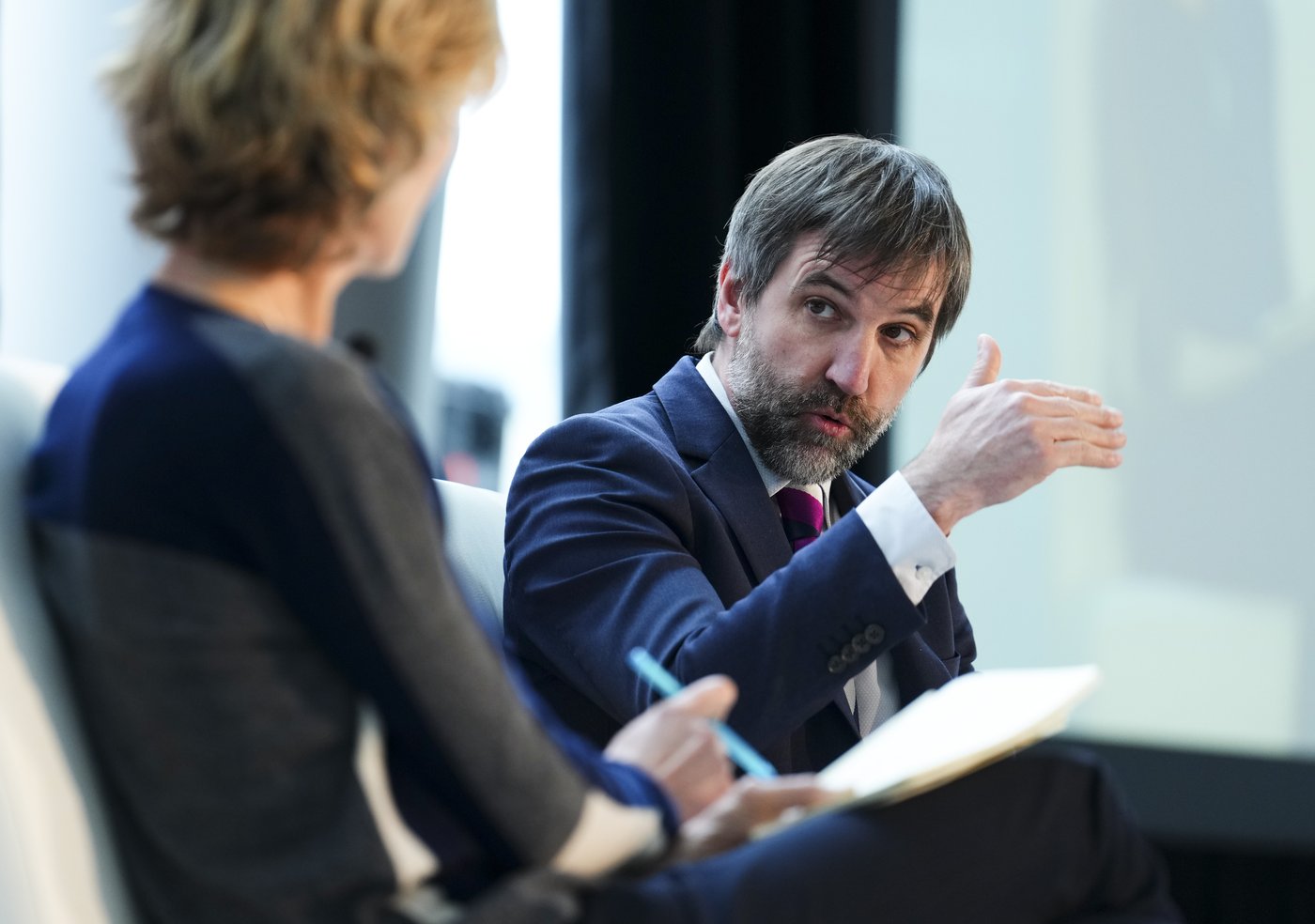 Minister of Environment and Climate Change Steven Guilbeault takes part in a conversation with Diana Fox Carney, Senior Adviser, Eurasia Group and Strategic Advisory Board Member, Terramera, during the Canada 2020 Net-Zero Leadership Summit in Ottawa on Wednesday, April 19, 2023. Guilbeault says a new analysis of the social cost of carbon emissions suggests the economic cost of greenhouse gas emissions is nearly five times higher than previously thought. THE CANADIAN PRESS/Sean Kilpatrick