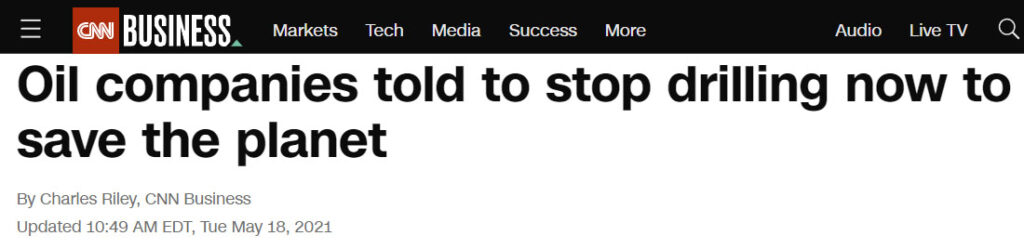 Oil companies have been repeatedly told they have no future. Only 18 months ago the International Energy Agency told oil producers not to invest in new supplies. A CNN headline read, “Oil companies advised to stop drilling now to save the planet.”