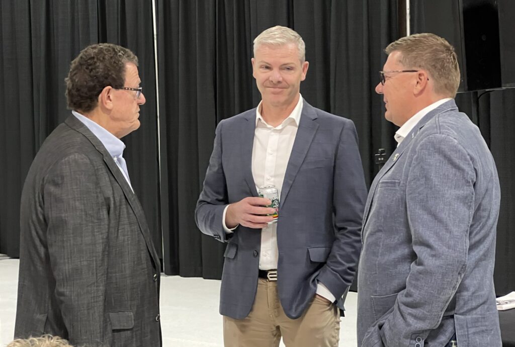 David Yager, left, speaking to former CAPP president and CEO Tim McMillan, centre, and Saskatchewan Premier Scott Moe, at the Lloydminster Heavy Oil Show. Photo by Brian Zinchuk