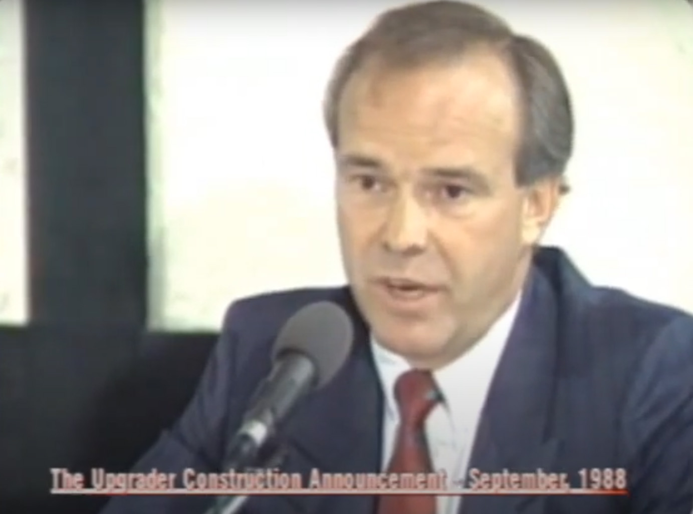 Premier Grant Devine at the initial announcement of the Lloydminster Bi-Provincial Upgrader in September, 1988. Screenshot, YouTube/CITL CKSA News