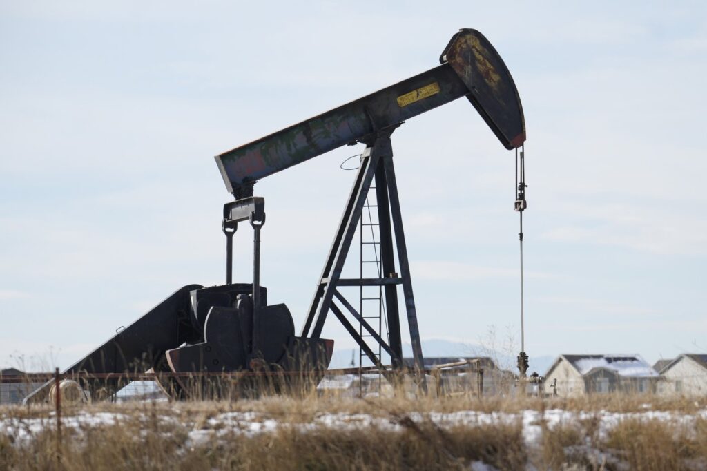 An oil pumper stands in a field along Interstate 25 on Thursday, Nov. 30, 2023, near Erie, Colo. On Friday, the Labor Department releases producer prices data for December.(AP Photo/David Zalubowski)