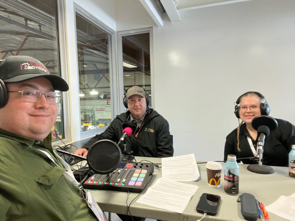 From left: Brian Zinchuk, Darcy McCormick and Katrina Zinchuk, in the broadcast booth overlooking the oil show. Photo by Brian Zinchuk