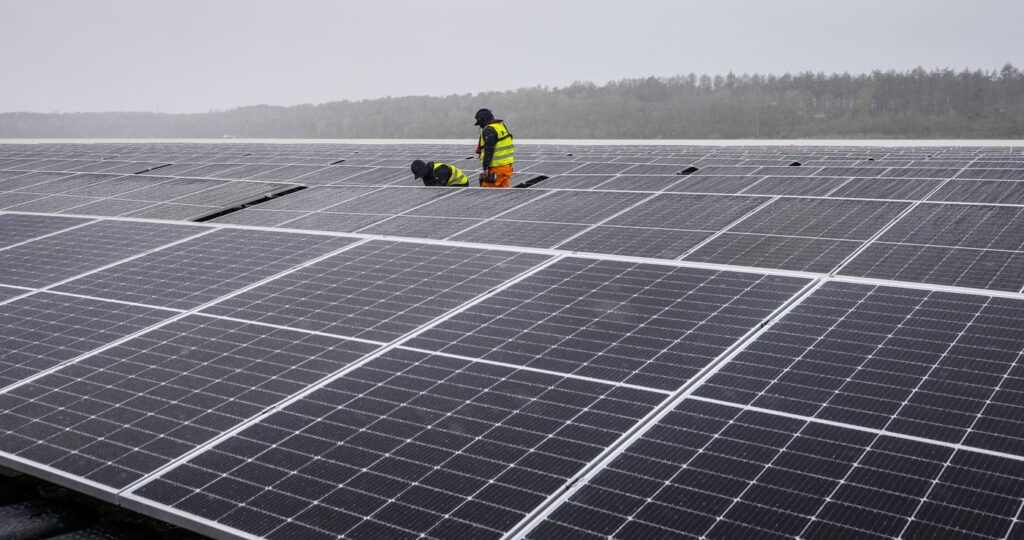 Solar panels are installed at a floating photovoltaic plant on a lake in Haltern, Germany, Friday, April 1, 2022. Once completed, around 5,800 photovoltaic modules will produce around 3 million kilowatt hours of electricity per year, saving 1,100 tons of CO2 to fight climate change with renewable power instead of oil, gas and coal. (AP Photo/Martin Meissner)