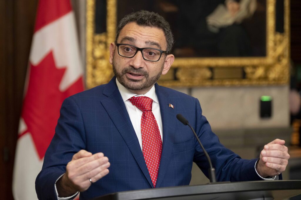 Minister of Transport Omar Alghabra speaks with members of the media after tabling legislation in the House of Commons, Thursday, Nov. 17, 2022 in Ottawa. The federal government has announced an investment of another $1.2 billion in its Ocean Protection Plan for 29 projects involving ocean safety, science and environmental safeguards. THE CANADIAN PRESS/Adrian Wyld