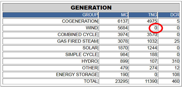 Wind remained at 0 megawatts output for 52 minutes, from 9:51 to 10:43 a.m. It again fell to zero after that point, showing zero at 11:05 a.m., but at some point this story needed to be published.